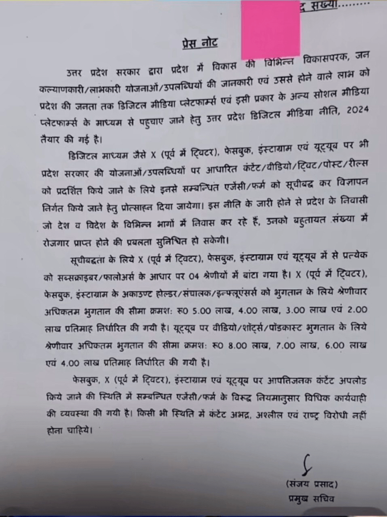 उत्तर प्रदेश सोशल मीडिया पॉलिसी के अंतर्गत 28 अगस्त 2024 को आधिकारिक रूप से प्रेस रिलीज किया गया जिसमें बताया गया है कि इस पॉलिसी के अंतर्गत इस योजना के अंतर्गत सरकार के जितने भी स्कीम है उससे संबंधित जितने भी यूट्यूब इंस्टाग्राम फेसबुक ट्विटर चैनल है या पेज है जिस पर उत्तर प्रदेश सरकार द्वारा जारी किए गए अलग-अलग विज्ञापन के साथ योजना की जानकारी देंगे उन्हें इस सोशल मीडिया पॉलिसी के अंतर्गत उन्हें निर्धारित फॉलोअर और न्यूज़ के आधार पर उनके महीने की अर्निंग या कमाई तय की जाएगी।
